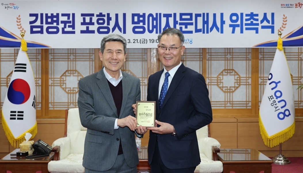 이날 이강덕 시장은 김병권 명예자문대사에게 위촉패를 전달하고, 포항시의 해외 투자유치 및 정책 수립에 전략적 조언 등 지방외교의 가교역할을 해줄 것을 당부했다.
