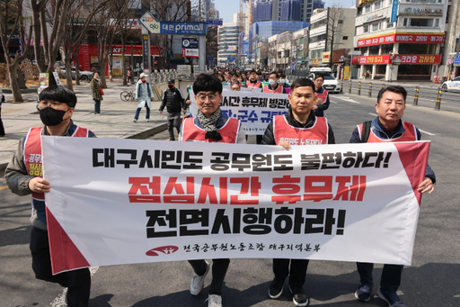 전국공무원노동조합 대구지역본부는 점심시간 휴무제 전면 시행을 요구하고 있다. 노조 측은 우체국 등 공공기관, 은행 등에서 점심시간 휴무제를 운영 중이며 시민 반응도 긍정적으로 변하고 있다고 주장한다. 이들은 최근 중구 동성로에서 ‘점심시간 휴무제 전면 시행 쟁취 총력 투쟁’ 집회를 열기도 했다. 대구시 구청장·군수협의회는 26일 회의에서 점심시간 휴무제 시행 여부를 논의할 예정이다.