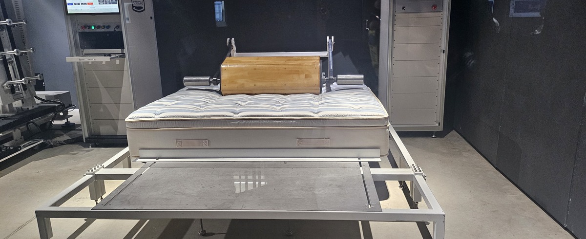 실험실 입구에 들어서자 ‘롤링 테스트(ASTM 내구성 테스트)’ 존에서 109㎏의 두툼한 육각형 원목이 분당 15회 속도로 매트리스 위를 구르고 있었다. 사람이 뒤척이는 상황을 연출해 매트리스 원단의 훼손·스프링 휘어짐 및 끊어짐 등을 관찰하는 실험이다.