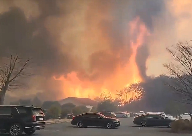 경북 의성 산불이 건조한 대기와 강풍을 타고 안동으로 급속도로 확산하고 있다. 안동시는 시민들에게 대피령을 내렸다.