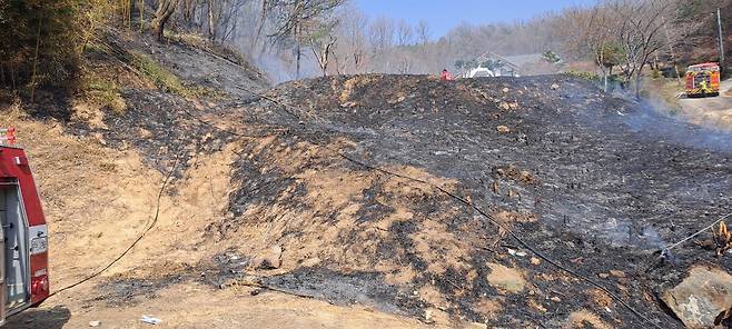 지난 23일 오전 11시55분쯤 옥천군 청성면 조천리 한 야산에서 불이 나 약 40ha에 달하는 임야를 태웠다. 충북도 관계자는 “산불이 난 곳에서 다시 불이 나 신속히 대응해 주불을 진화할 수 있었다”고 말했다.