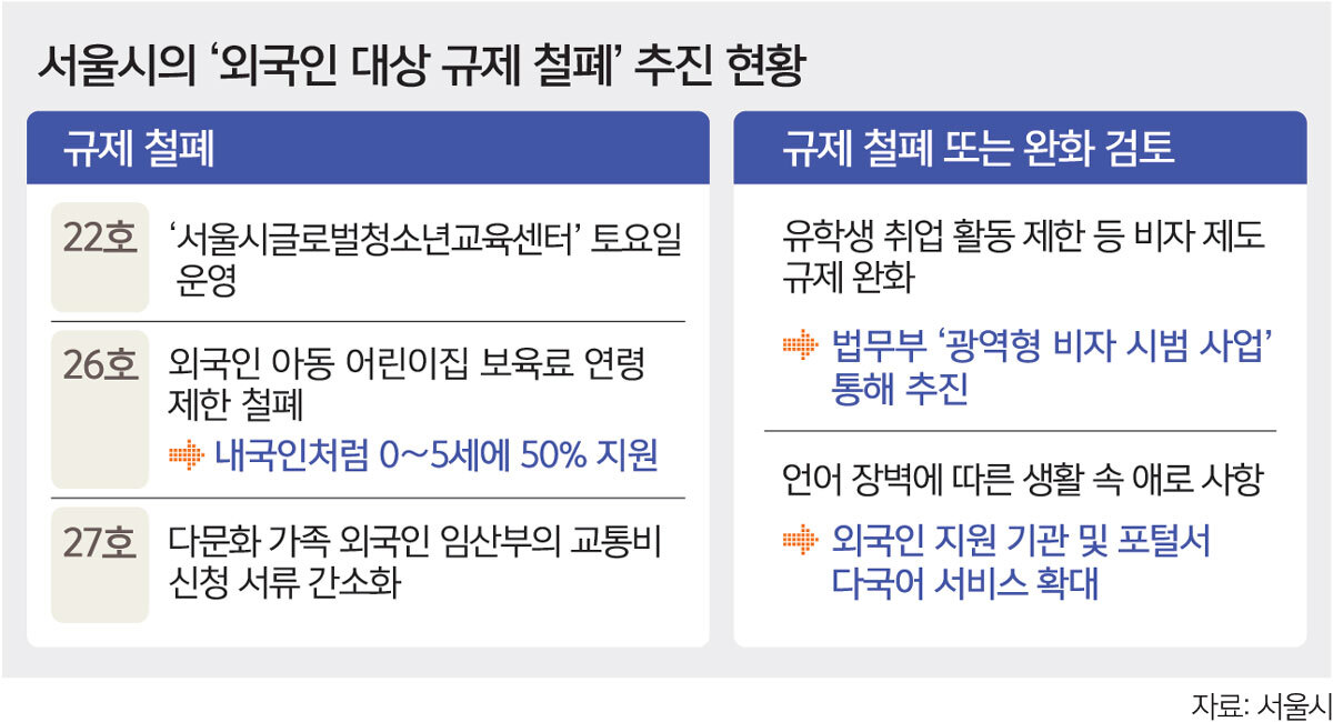 25일 시에 따르면 외국인만을 대상으로 한 규제 철폐로는 지난달 발표했던 외국인 아동 어린이집 보육료 연령 제한 철폐(26호)와 다문화 가족 외국인 임산부의 교통비 신청 서류 간소화(27호)도 있다.