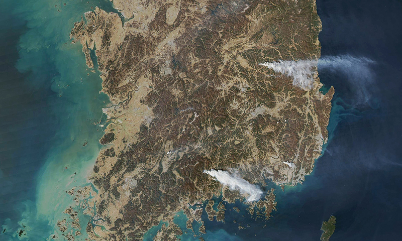 ‘산불이 한국을 태우다’는 제목과 함께 제공된 사진에는 의성과 경남 산청 지역에서 선명하게 보이는 하얀 연기가 동쪽으로 흘러가고 있다.