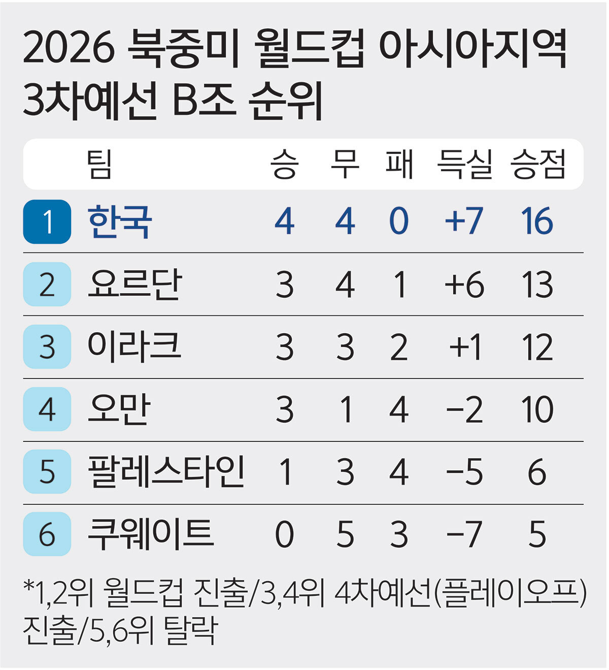한국은 26일 현재 4승4무(승점 16)로 2026 FIFA 북중미 월드컵 아시아 지역 3차 예선 B조 선두를 달리고 있다. 오만, 요르단과의 경기에서 잇달아 무승부를 기록하며 조기에 월드컵 본선 진출을 확정하지 못했지만 운이 따라줬다. 이라크가 이날 팔레스타인에 충격적인 1-2 역전패를 당하면서 6월5일 예정된 이라크와의 원정 9차전에서 반드시 승리해야 한다는 부담을 덜게 됐다. 이라크가 3승3무2패(승점 12)로 조 3위에 머물면서, 한국은 남은 이라크, 쿠웨이트전에서 승점 1만 따내도 조 2위를 확보할 수 있게 됐다. 이번 북중미 월드컵에서 아시아축구연맹(AFC) 가맹국에 할당된 월드컵 본선 티켓은 8.5장이다. 3차 예선 각 조 1~2위가 본선에 직행하고, 조 3~4위는 4차 예선을 통해 다시 도전하는 구조다. 한국이 이라크전에서 무승부만 해도 11회 연속(통산 12회) 월드컵 본선에 나가게 된다.