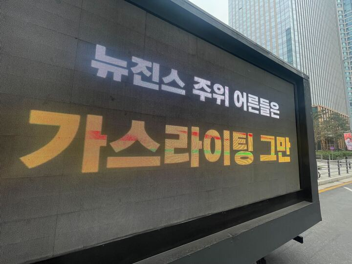 트럭 전광판에는 ‘뉴진스 주위 어른들은 가스라이팅 그만’, ‘이미 공백기 1년, 소송으로 3년 추가, 모두에게 잊혀진다’, ‘어른들은 뉴진스를 아낀다면 위험에 빠뜨리게 하지말라, 위약금은 뉴진스의 몫이다’라는 문구를 담았다.