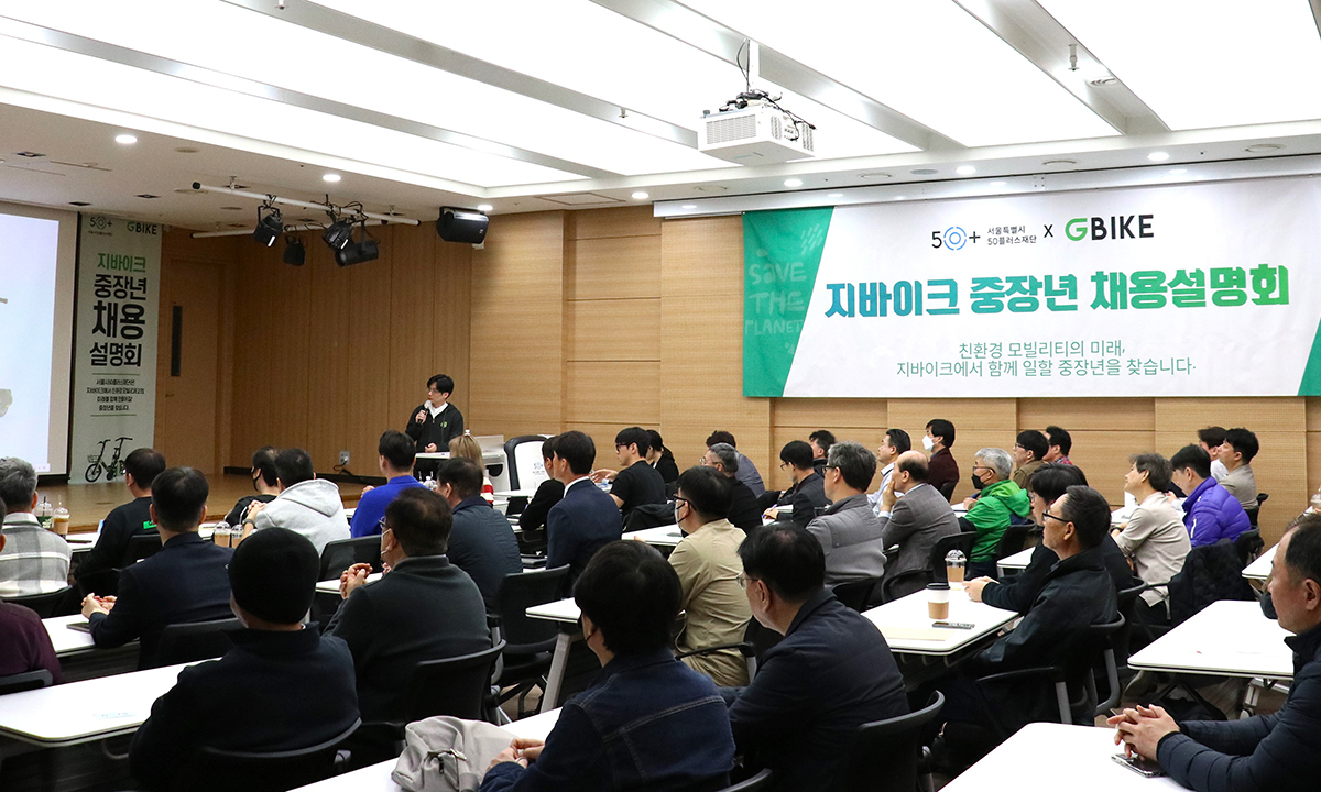 자전거 정비, 수거·재배치 등을 맡는 직원 10명을 채용하는 이날 설명회에는 65명의 구직자가 문을 두드렸다. 준비한 자리가 모자라 의자를 추가로 배치할 정도로 시민들 호응이 높았다. 김정민 지바이크 인사팀장은 “중장년층의 경우 높은 소득보다도 정규직이라는 안정성을 선호하는 편”이라며 “현장 대처가 유연하고 업무 외적으로도 다른 직원의 멘토 역할도 수행하는 장점이 있다”고 설명했다.