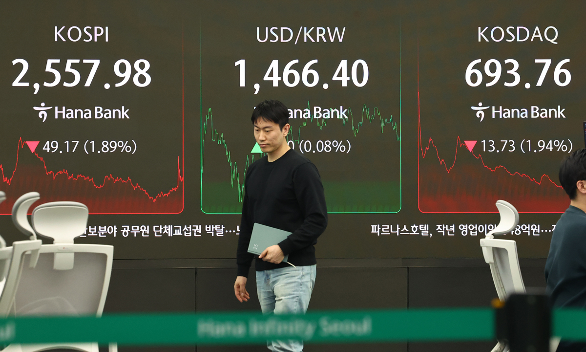 하락 마감한 코스피·코스닥 지수 (서울=연합뉴스) 서대연 기자 = 28일 서울 중구 하나은행 본점 딜링룸 현황판에 코스피, 코스닥 지수가 표시돼 있다. 이날 코스피는 전 거래일 대비 49.17p(1.89%) 내린 2,557.98로, 코스닥 지수는 13.73p(1.94%) 내린 693.76으로 마감했다. 2025.3.28 dwise@yna.co.kr/2025-03-28 16:02:09/ <저작권자 ⓒ 1980-2025 ㈜연합뉴스. 무단 전재 재배포 금지, AI 학습 및 활용 금지>