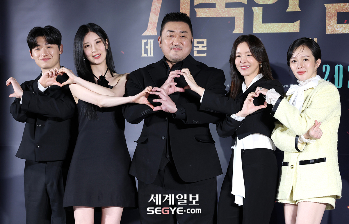 배우 이다윗, 서현, 마동석, 경수진, 정지소(사진 왼쪽부터)가 2일 서울 광진구 롯데시네마 건대입구에서 열린 영화 '거룩한 밤: 데몬 헌터스’(감독 임대희) 제작보고회에 참석해 포즈를 취하고 있다.