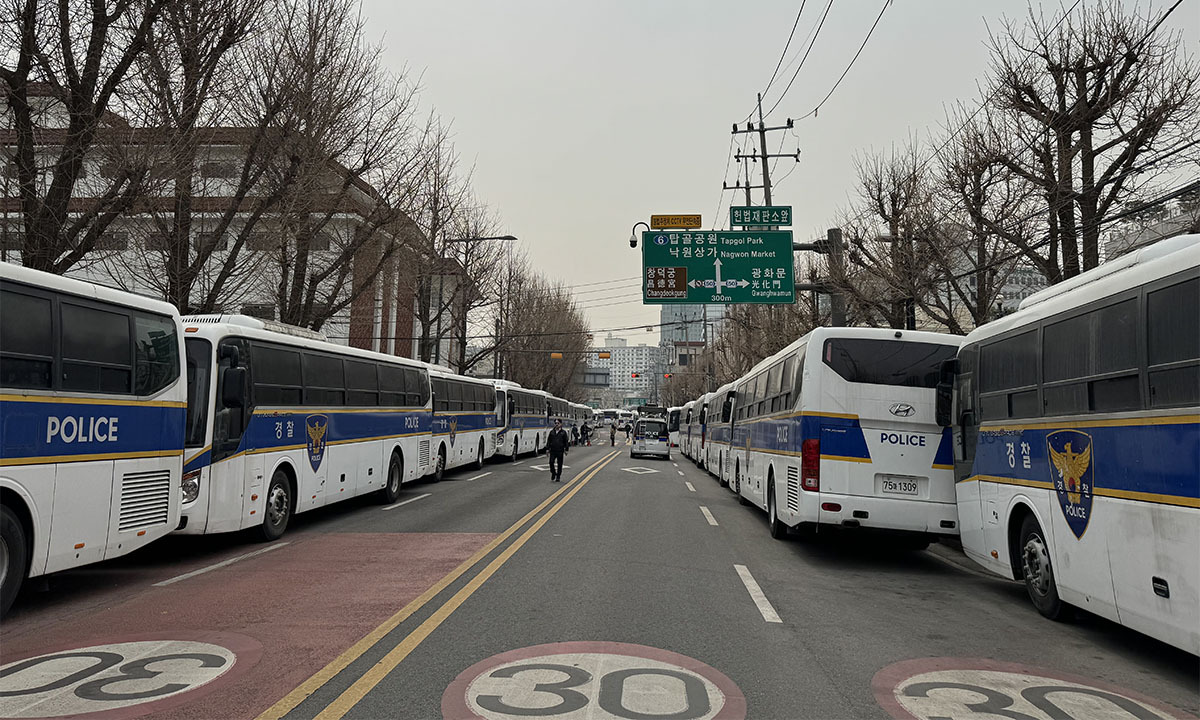 윤석열 대통령 탄핵심판 선고를 이틀 앞둔 2일 서울 종로구 헌법재판소 앞에서 만난 한 인근 주민은 이날 헌재 주변 상황을 두고 이렇게 말했다. 그의 말대로 헌재는 수백미터에 걸쳐 둘러진 경찰 버스 ‘차벽’으로 요새화된 모습이었다. 헌재로 향하는 길목마다 차단벽과 펜스가 세워졌고 이곳을 지나기 위해선 경찰의 신원 확인을 거쳐야 했다. 일부는 경찰에게 가방 내부까지 보이는 검문을 받기도 했다.