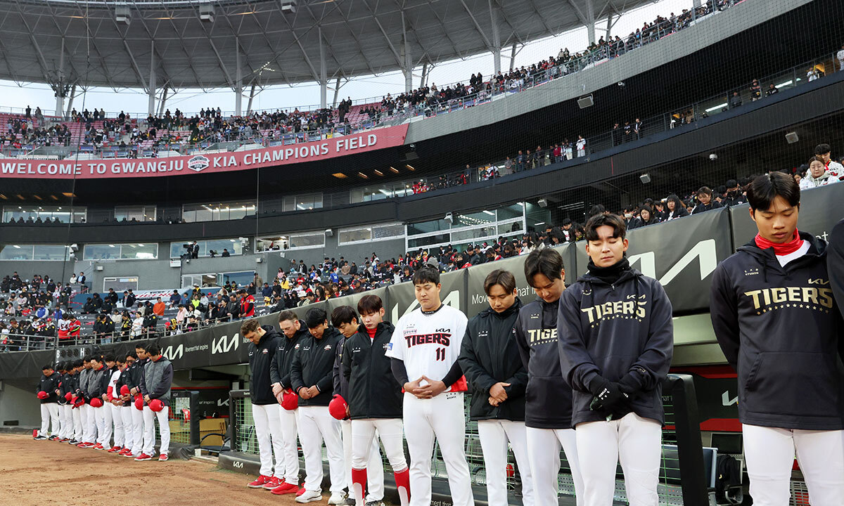 NC파크 사고 희생자 추모하는 KIA 선수들 입력 : 2025-04-02 22:51:35 수정 : 2025-04-02 22:51:34 구글 네이버 유튜브 프로야구 KIA 선수들이 2일 광주 기아챔피언스필드에서 열린 삼성과 경기에 앞서 지난달 29일 창원 NC파크 구조물 추락 사고로 사망한 야구팬을 추모하는 묵념을 하고 있다. 이날 4곳에서 열린 프로야구 경기는 선수들이 어깨에 검은 리본을 달고 응원단 없이 진행됐다. <연합>연합> Copyright ⓒ 세계일보. 무단 전재 및 재배포 금지 연합