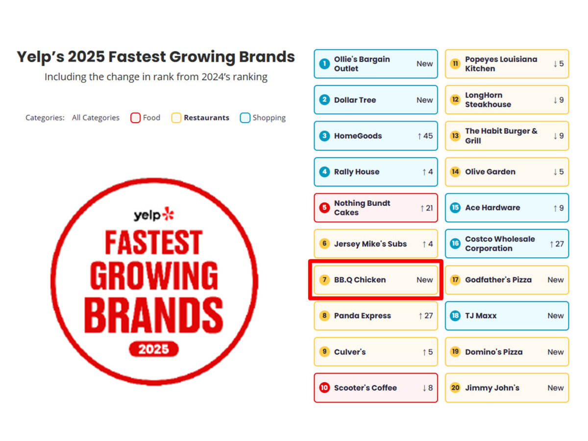 옐프는 지난해 고객 리뷰 수, 검색량, 신규 비즈니스 개설, 소비자 행동 데이터 등을 기준으로 미국에서 가장 빠르게 성장하고 있는 리테일 브랜드 50개를 선정하고 순위를 공개했다. BBQ는 여기에서 전체 7위에 올랐다.
