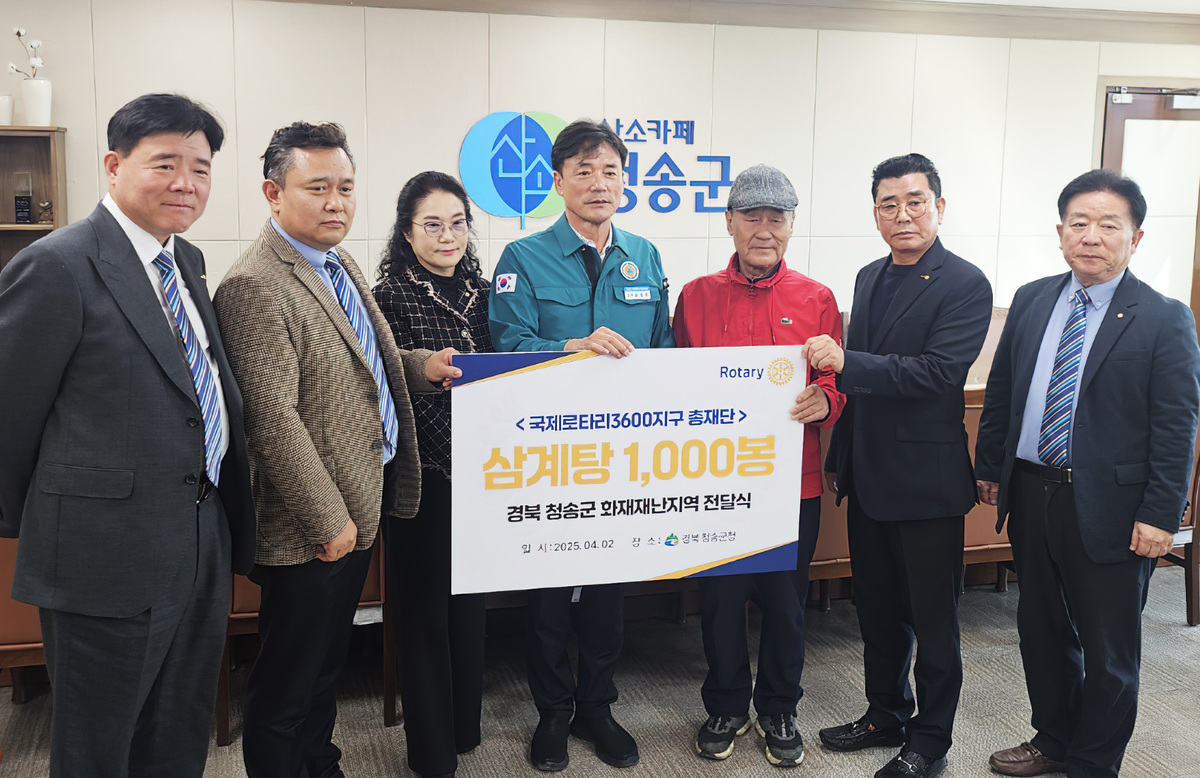 ‘국제로타리 3600 지구’ 총재단이 대규모 화재로 큰 피해를 입은 경북 청송군을 찾아 성금 1000만원과 삼계탕 1000마리를 전달하며 피해 복구에 동참했다.