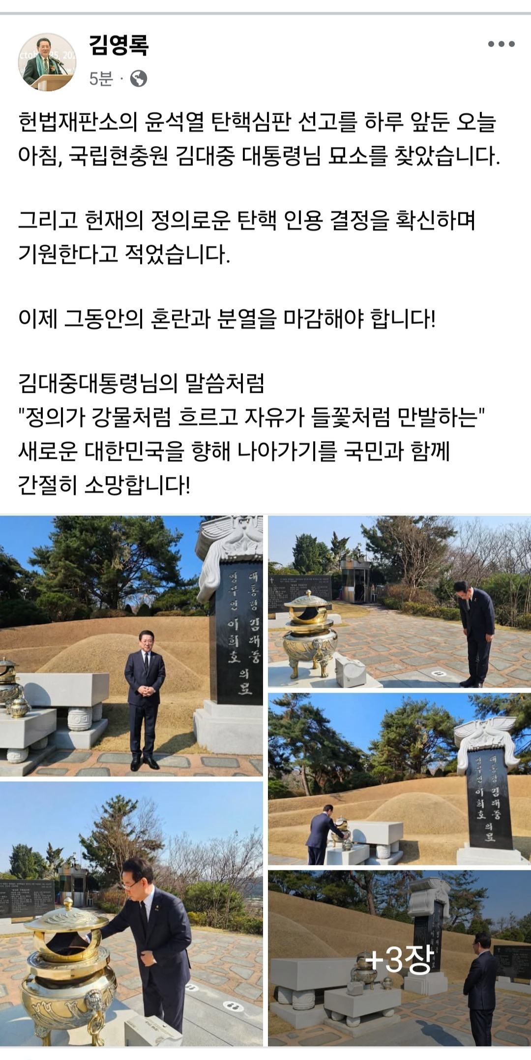 김영록 전남지사가 헌법재판소의 윤석열 대통령 탄핵 심판을 하루 앞둔 3일 국립현충원을 찾아 김대중 전 대통령의 묘소를 참배했다.