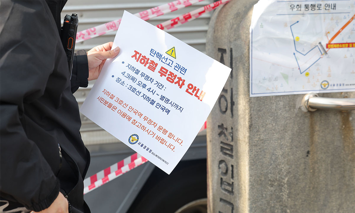 공사는 윤석열 대통령에 대한 헌재의 탄핵 심판 선고가 예정된 4일까지 무정차 통과·출구 폐쇄를 이어갈 방침이다.