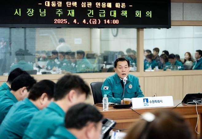 4일 이재준 수원시장이 시청에서 긴급대책회의를 주재하고 있다. 수원시 제공