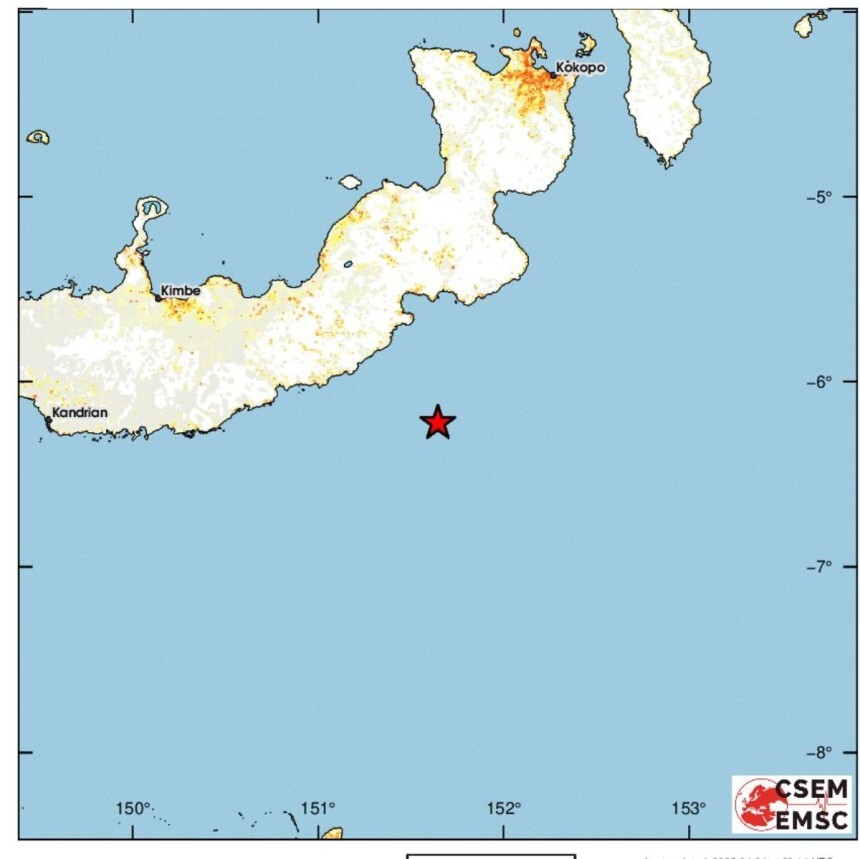 4일(현지시간) 유럽지중해지진센터(EMSC) 등에 따르면, 지진 발생 위치는 파푸아뉴기니 뉴브리튼섬 킴베에서 동쪽으로 174㎞ 떨어진 곳이다.