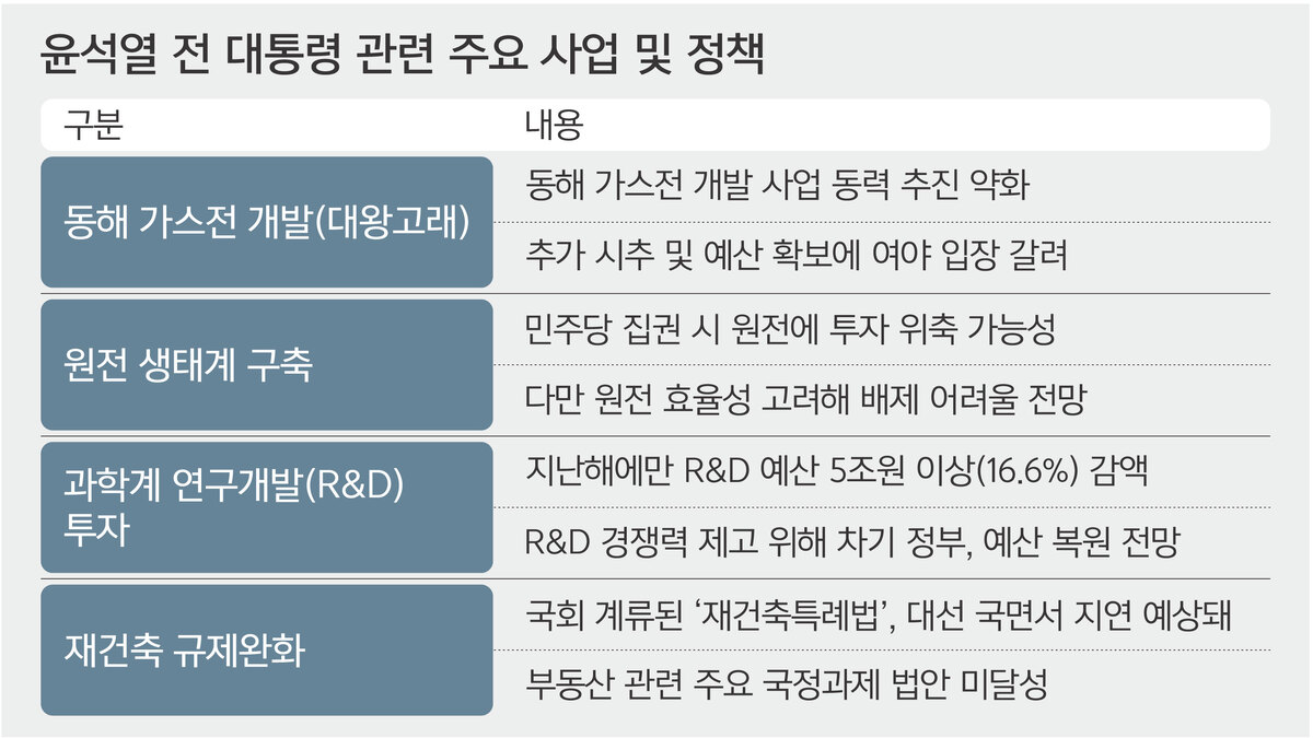 파면된 윤석열 전 대통령 표 사업이라는 꼬리표가 붙은 경제·산업분야 핵심 국정 과제의 좌초·중단이 예상되면서 이에 따른 부정적 영향을 최소화해야 한다는 목소리가 나온다. 동해 심해 가스전(‘대왕고래 프로젝트’) 개발과 원자력발전 산업 강화, 부동산 규제 완화 추진 등이 그것인데, 이들 과제는 최소한 새 정부가 들어설 때까지 추진 동력을 얻기 어렵다는 분석이 지배적이다.