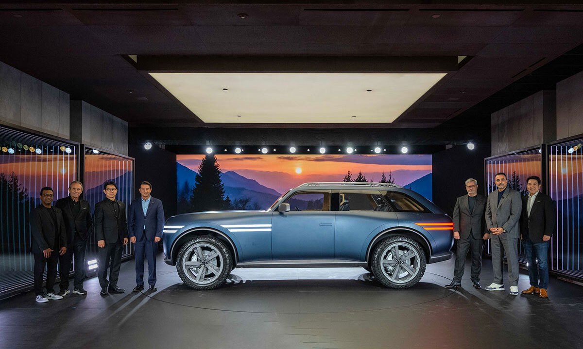 외관은 제네시스의 ‘환원주의적 디자인’을 기반으로 깔끔한 선과 간결한 표면을 강조했고, 긴 후드와 가파른 C필러(뒷문과 뒤 유리창 사이의 기둥)가 기존 SUV에서 볼 수 없는 독특한 실루엣을 완성했다. 위아래로 나뉘어 열리는 후면부의 분할 개폐식 테일게이트는 제네시스의 시그니처 투라인 헤드램프와 조화를 이루어 실용성과 디자인을 동시에 만족시켰다. 이날 행사에서 제네시스는 2026년부터 레이싱 경기에 투입될 ‘GMR-001 하이퍼카’의 실차 디자인 모델도 공개했다. 전면에서 측면까지 이어진 제네시스 고유의 두 줄 디자인을 바탕으로 공기역학적인 구조와 볼륨감을 완성했다.