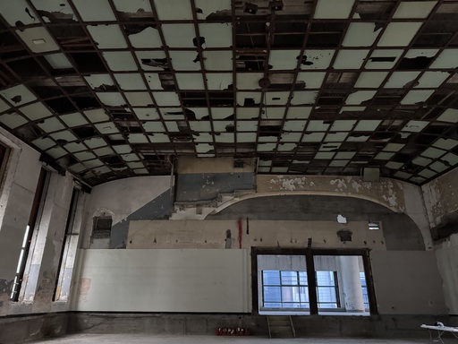 지난 5일 대전 중구 은행동 옛 대전부청사 3층 대강당. 대전부청사는 일제강점기였던 1937년 지어진 근대건축물로, 대전시 첫 청사이기도 하다. 88년 전 처음 지어졌을 때 공회당(대집회장)으로 쓰인 이 공간은 당시 날것의 모습 그대로였다. 바둑판 모양의 격자 형태로 끝이 곡선으로 말려 있는 ‘궁륭형 우물반자’ 천장(사진)은 세월의 더께에 찢긴 콘크리트가 노출돼 있었고 양쪽 벽엔 커튼월 방식의 통창이 일렬로 나란히 나 있다. 창문 아래의 가는 선은 당시 바닥이 평면이 아니라 기울어져 있음을 알 수 있게 한다.