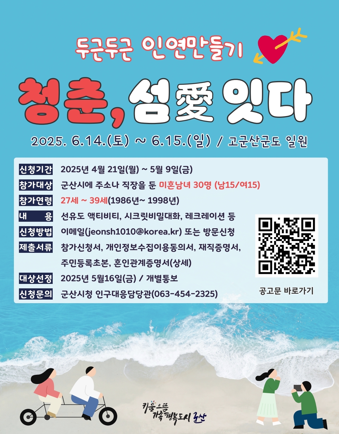 군산시는 6월 14일과 15일 1박2일 일정의 특별한 만남 프로젝트인 두근두근 인연만들기를 ‘청춘, 섬愛(애)잇다’를 주제로 진행한다고 18일 밝혔다.