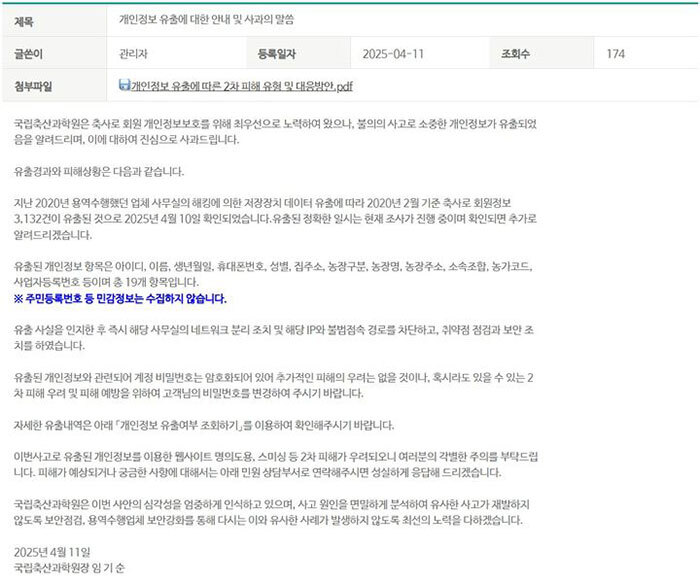 국립축산과학원이 사건을 공식적으로 알린 건 18일 오전. ‘불의의 사고로 회원 여러분의 소중한 개인정보가 유출된 점 깊이 사과드린다’며 고개를 숙였지만, 이미 사태는 걷잡을 수 없이 커졌다.