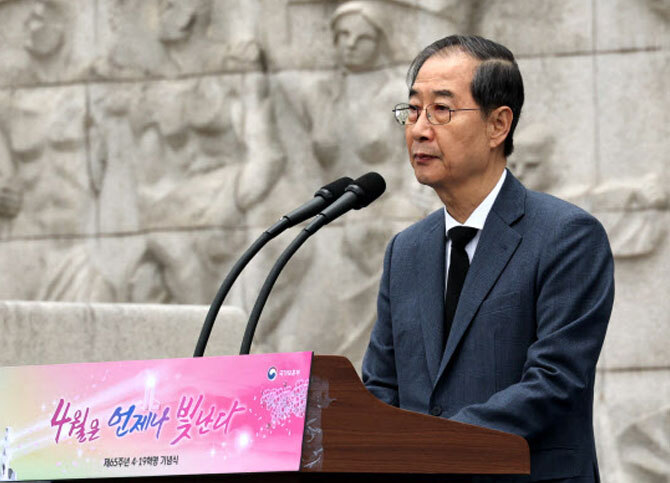 한 권한대행은 이날 서울 강북구 국립 4·19민주묘지에서 열린 65주년 4·19 혁명 기념식에 참석해 "우리 앞에는 여전히 수많은 도전과 난제가 놓여있다"면서 이같이 밝혔다.