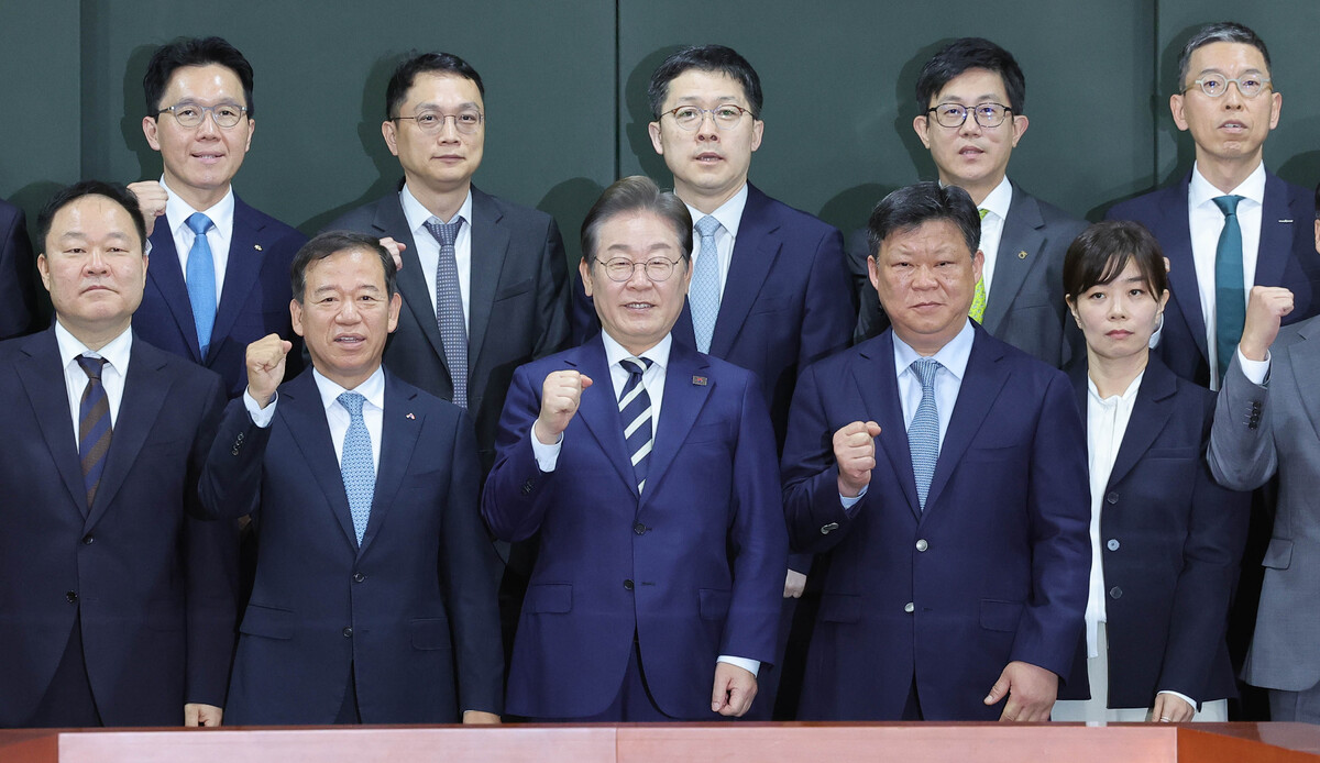 이재명 더불어민주당 경선 후보가 21일 서울 여의도 금융투자협회에서 열린 자본시장 활성화를 위한 정책간담회에서 서유석 금융투자협회장을 비롯한 참석자들과 기념촬영을 하고 있다.