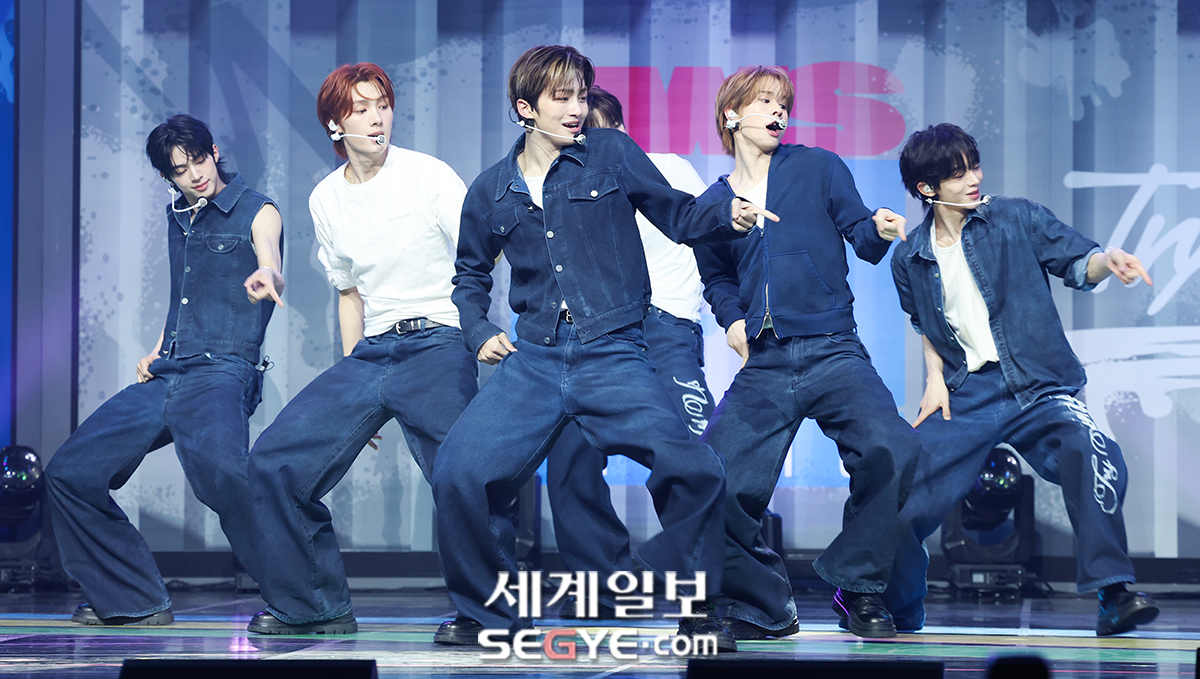 그룹 투어스가 21일 서울 용산구 한남동 블루스퀘어에서 열린 미니 3집 '트라이 위드 어스'의 쇼케이스에 참석해 열띤 공연을 펼치고 있다.