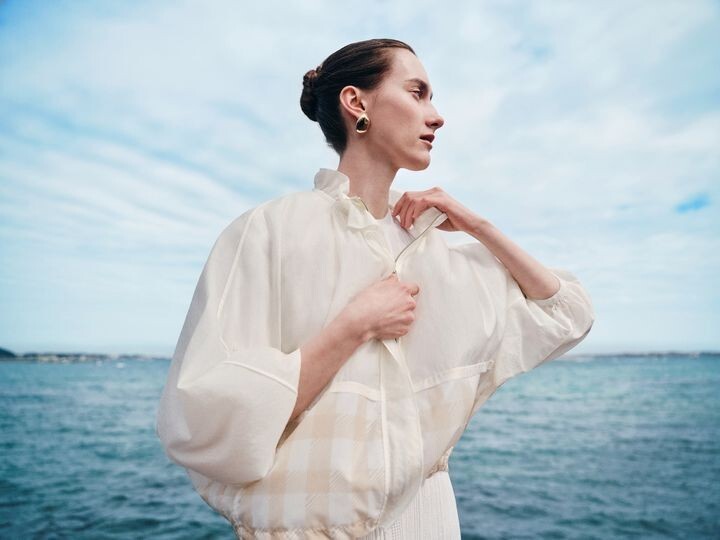 또 가볍게 흩날리는 소재에 자연스러운 셔링과 허리 스트링을 더해 실루엣에 볼륨감을 주며 여성스러운 무드를 강조했다.
