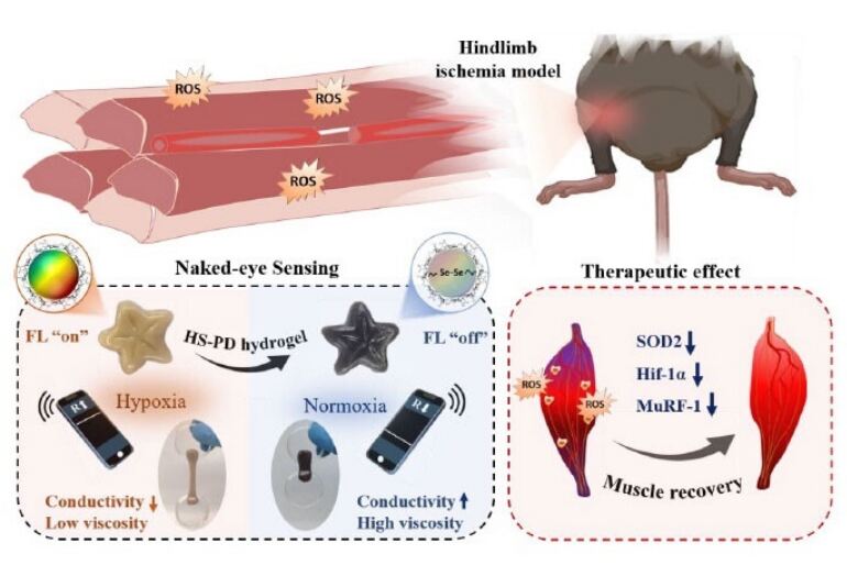 연구진이 개발한 HS-PD 하이드로겔은 허혈성 환경에서 과다 생성된 활성산소(ROS)에 의해 디셀렌이드 결합이 선택적으로 절단되면서 형광 신호가 켜지고 전기전도성과 기계적 강도가 크게 향상된다. 또한 산소 농도에 따라 색상이 변화해 별도의 장비 없이도 맨눈으로 허혈 상태를 감지할 수 있다.