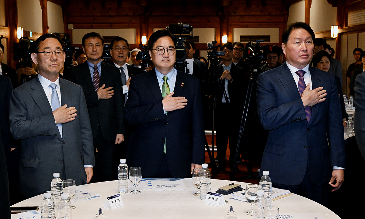 글로벌 경제 위기와 급변하는 산업 흐름에 대응하기 위해 국가 산업의 정책 지원 방안을 모색하는 국회 ‘미래산업포럼’이 22일 공식 출범했다. 사진은 이날 서울 여의도 국회에서 열린 포럼 발족식에서 주호영 국회부의장(앞줄 왼쪽부터), 우원식 국회의장, 최태원 대한상공회의소 회장이 국기에 대한 경례를 하는 모습.