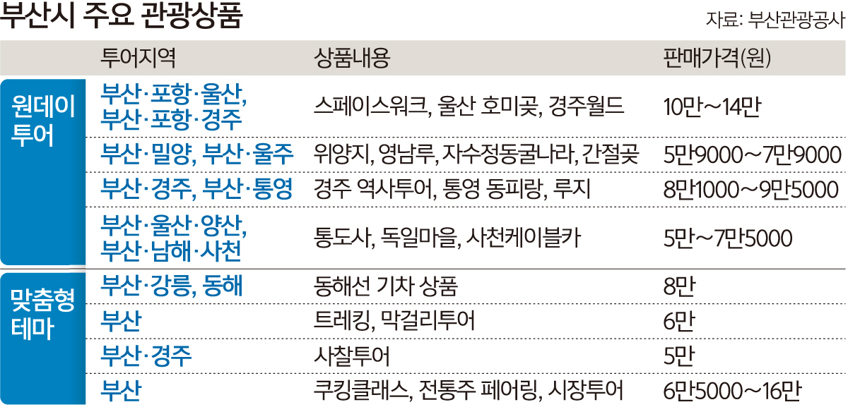 부산 인근 지역을 대형버스나 밴 차량을 이용해 둘러보는 원데이 투어상품은 외국인 개별관광객에게 편리한 이동 교통수단과 효율적인 일정을 제공해 인기를 끌 것으로 기대된다. 대표적인 상품은 △부산∼포항∼울산 △부산∼밀양∼울주 △부산∼경주 투어를 꼽을 수 있다.