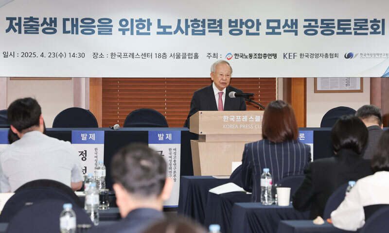 정성미 한국여성정책연구원(여정연) 연구위원은 23일 서울 중구 한국프레스센터에서 한국경영자총협회(경총), 한국노동조합총연맹(한국노총), 여정연 주최로 열린 ‘저출생 대응을 위한 노사협력 방안 모색 공동토론회’에서 이같이 말했다.