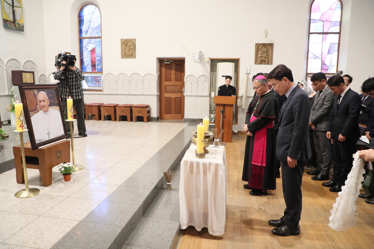 김 지사는 이날 오후 3시30분 도청 간부와 도청 내 천주교 신자 등으로 구성된 조문단과 함께 춘천 주교좌 죽림동 예수성심성당에 마련된 프란치스코 교황 분향소를 찾았다.