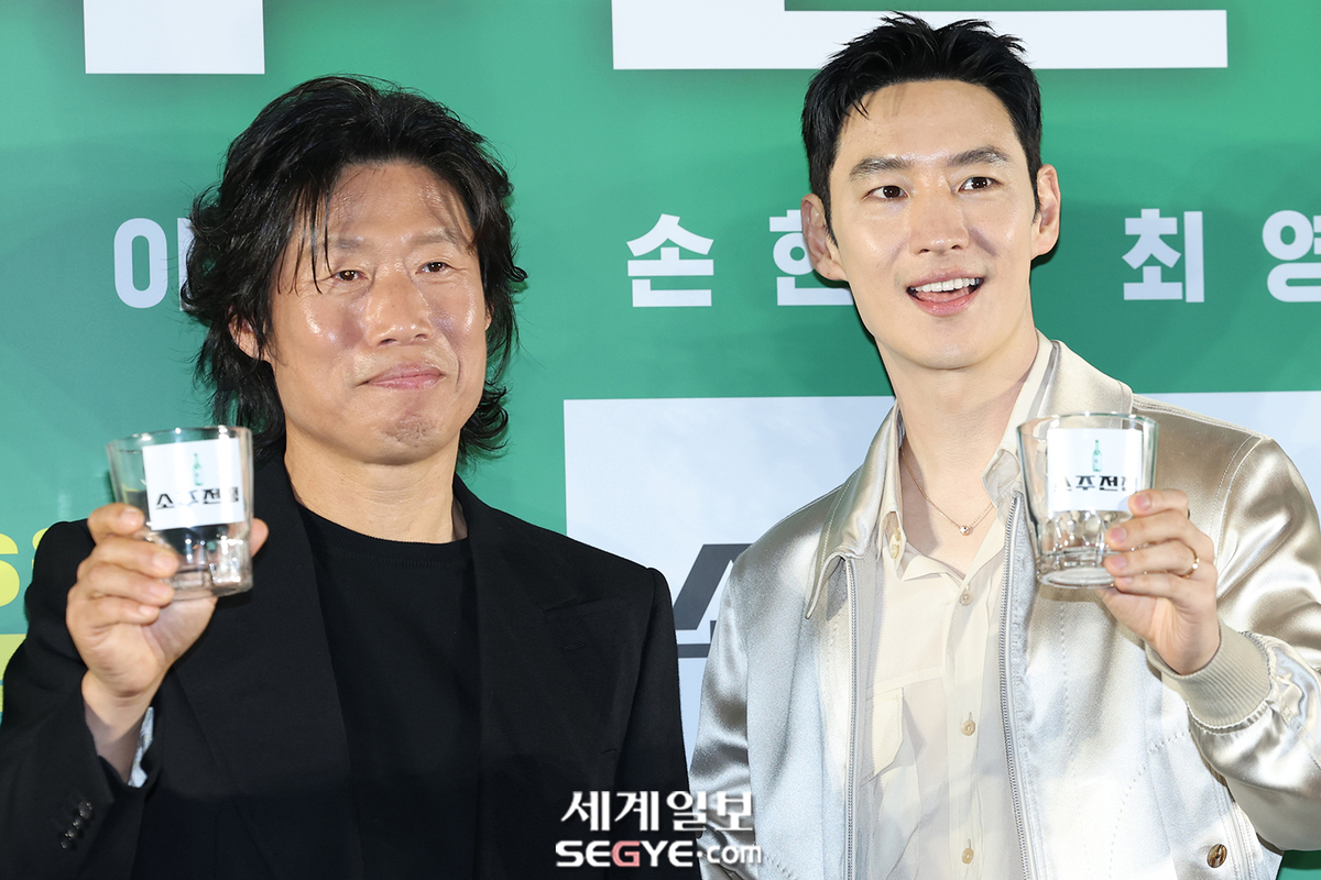 배우 유해진(사진 왼쪽)과 이제훈이 24일 서울 강남구 삼성동 메가박스 코엑스점에서 열린 영화 '소주전쟁' 제작보고회에 참석해 포즈를 취하고 있다.
