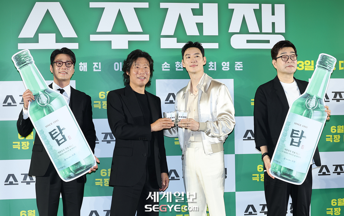 배우 최영준, 유해진, 이제훈, 손현주(사진 왼쪽부터)가 24일 서울 강남구 삼성동 메가박스 코엑스점에서 열린 영화 '소주전쟁' 제작보고회에 참석해 포즈를 취하고 있다.