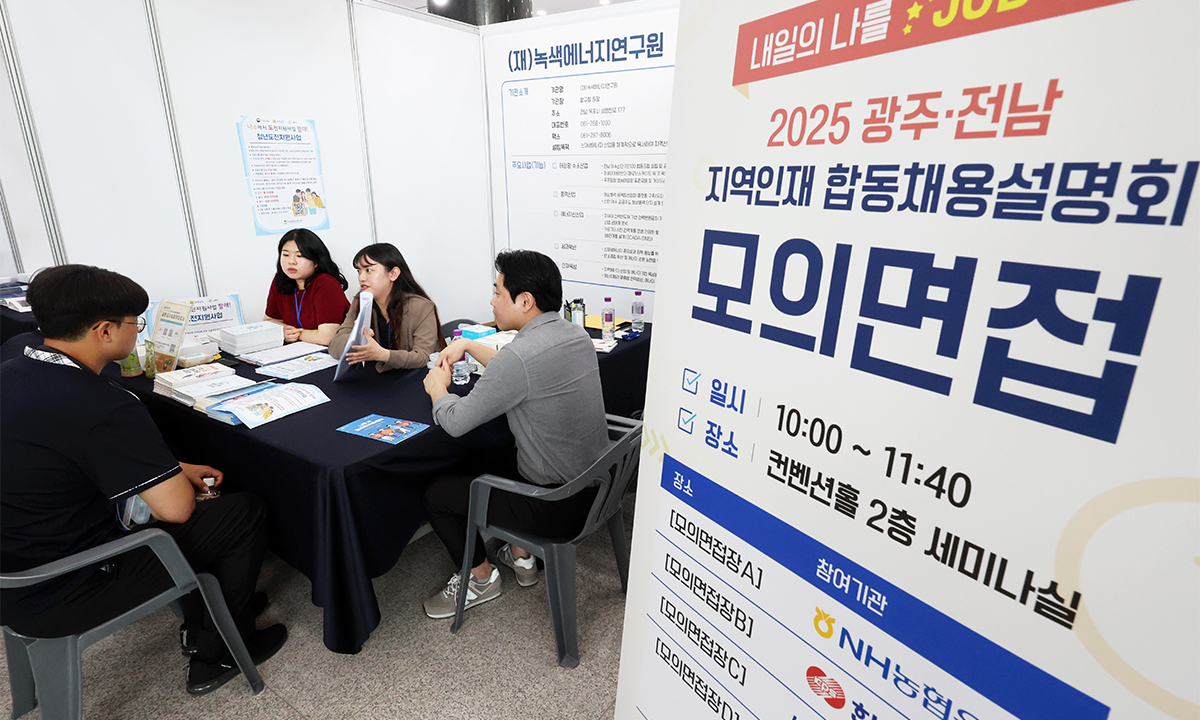 24일 광주 북구 전남대학교 컨벤션홀에서 열린 ‘2025 광주·전남 지역인재 합동 채용설명회’에서 취업준비생들이 인사담당자의 채용 설명을 듣고 있다. 국토교통부가 주최하고 광주시·전남도가 공동 주관하는 이번 채용설명회는 지역인재의 광주·전남 공동혁신도시 이전 공공기관의 채용 기회를 확대하고 취업 역량을 강화하기 위한 것이다. 한국전력공사·한국전력거래소·한국인터넷진흥원 등 13개 공공기관과 광주교통공사·전남연구원 등 9개 광주·전남 산하 공공기관, 광주은행·앰코테크놀로지코리아·한국알프스·기아자동차·금호타이어 등 33개 공공기관·기업이 참여했다.