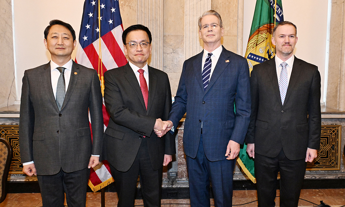 24일(현지시간) 미국 워싱턴에서 열린 ‘한·미 2+2 통상협의’를 앞두고 양국 대표단이 기념촬영을 하고 있다. 양국은 이날 도널드 트럼프 행정부가 이달 초 책정한 25% 상호 관세와 관련해 협상을 이어갔다. 왼쪽부터 안덕근 산업통상자원부 장관, 최상목 경제부총리 겸 기획재정부 장관, 스콧 베선트 미 재무장관, 제이미슨 그리어 미 무역대표부(USTR) 대표.
