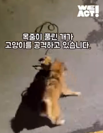 위액트가 사회관계망서비스(SNS)에 올린 영상을 보면 이 반려견은 목줄에서 벗어나 길고양이를 물고 강하게 흔들었다. 길고양이는 별다른 저항을 하지 못한 채 속수무책으로 공격을 당했다. 이를 본 견주는 천천히 다가와 목줄을 다시 잡았지만, 반려견의 행동을 적극적으로 말리지 않았다.