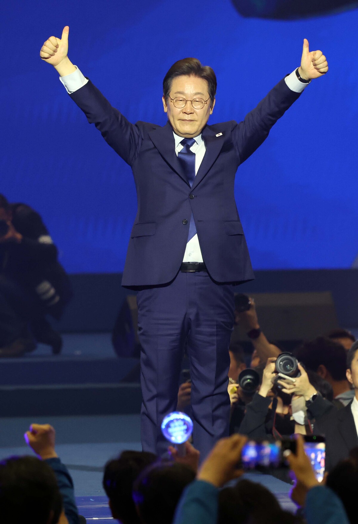 더불어민주당 대선후보로 확정된 이재명 전 대표가 27일 경기 고양시 킨텍스에서 열린 제21대 대통령선거 후보자 선출을 위한 수도권·강원·제주 합동연설회에서 손을 들어 답하고 있다.