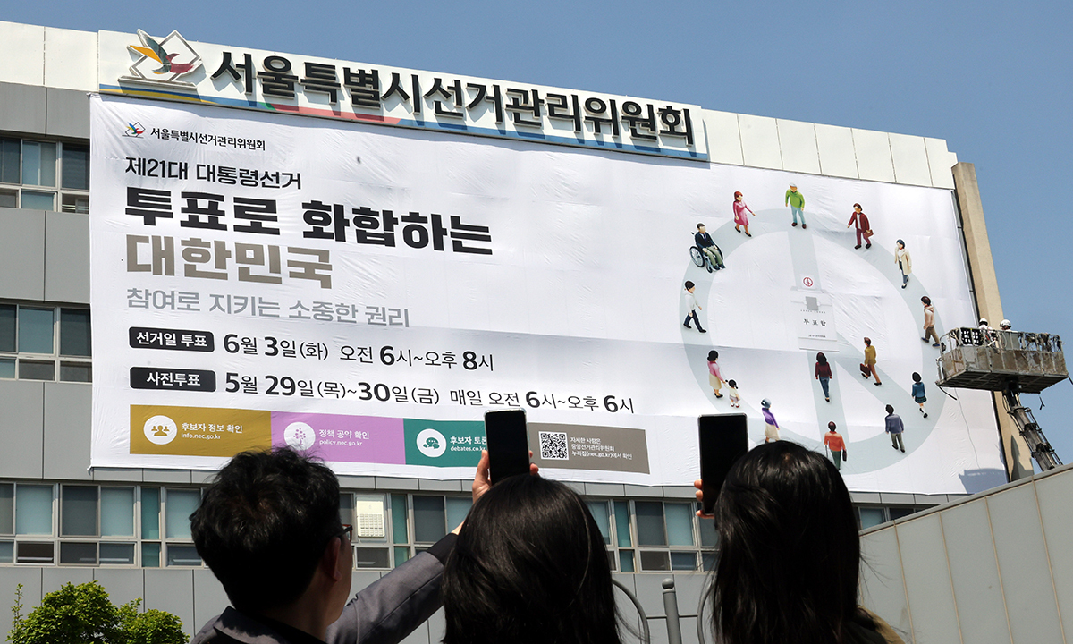 “투표 참여로 소중한 권리 지켜요”… 선관위, 독려 현수막 입력 : 2025-04-29 19:17:41 수정 : 2025-04-29 19:17:40 이제원 선임기자 구글 네이버 유튜브 제21대 대통령 선거가 35일 앞으로 다가온 29일 서울 종로구 서울시선거관리위원회 외벽에 선거 홍보용 대형 현수막이 붙었다. 이번 대통령 선거는 6월3일 조기 대선으로 치러진다. 이제원 기자 Copyright ⓒ 세계일보. 무단 전재 및 재배포 금지 세계일보 이제원