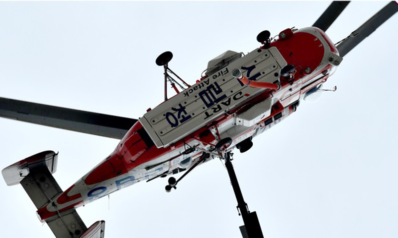 소방 당국과 지방자치단체는 헬기 4대를 투입해 쌓아둔 목재에서 시작한 불을 끄고 있다.