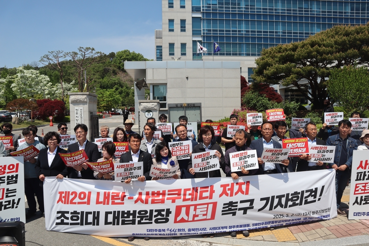 청주촛불행동, 더민주충북혁신회의, 조국혁신당 충북도당 창립준비위원회 등 충북지역 진보 성향 시민단체와 정당은 2일 청주지법 앞에서 기자회견을 열고 “이재명 민주당 대선 후보의 공직선거법 사건에 대해 대법원이 유죄 취지로 파기환송 판결을 한 것은 정치 개입을 노린 대법원의 무모한 졸속 판결”이라며 “사법부 스스로가 개혁 대상자임을 증명한 것과 함께 사법부가 자신들의 권력을 이용해 국민 주권을 침탈한 행위나 마찬가지”라고 목소리를 높였다.
