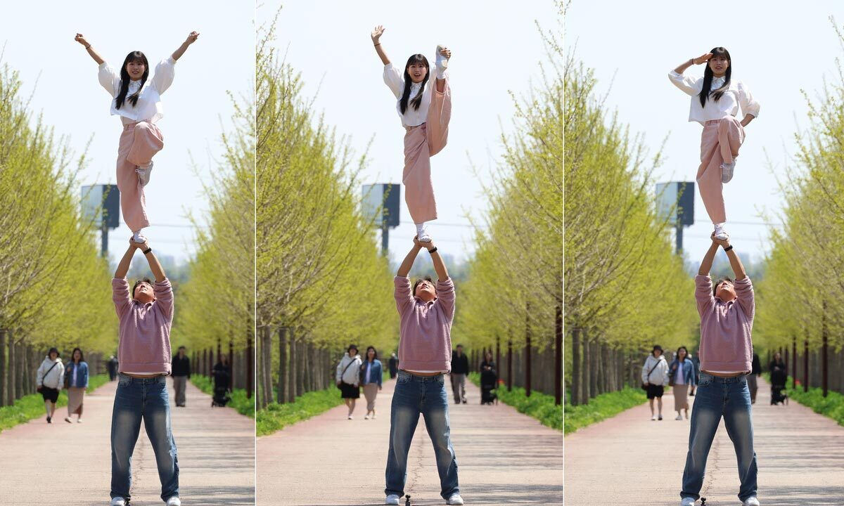 평범한 젊은 연인인 줄만 알았는데 남성이 여자친구의 허리를 잡더니 순식간에 머리 위로 번쩍 들어 올린다.
