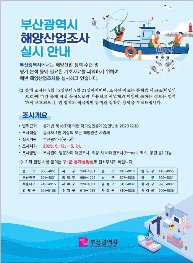 ‘부산해양산업조사’는 2011년 통계청으로부터 국가승인을 받아 처음 실시한 이후 올해 15회째를 맞은 부산의 대표적인 지역특화 통계조사다.