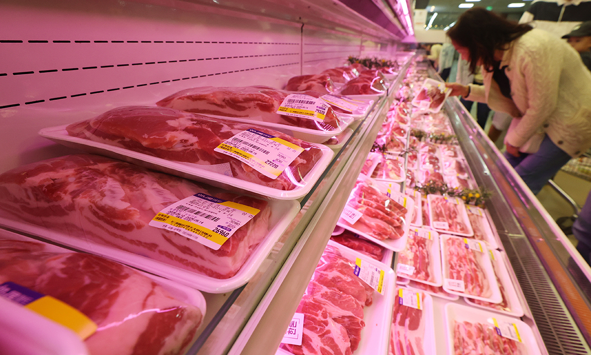 실제 지난달 수입 돼지고기 삼겹살(냉동) 가격을 보면 100g에 1472원으로 1년전, 평년보다 각각 3.2%, 7.8% 올랐다.