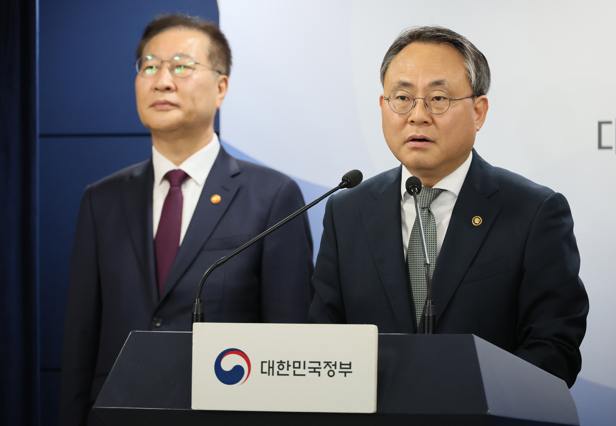 고기동 행정안전부 장관 직무대행(오른쪽)이 12일 서울 종로구 정부서울청사에서 제21대 대통령 선거 관련 대국민 담화문을 발표하고 있다. 연합뉴스