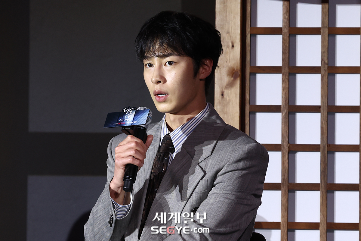 배우 이재욱이 13일 서울 신도림 라마다 호텔에서 진행된 넷플릭스 시리즈 '탄금'의 제작발표회에 참석해 인사말을 하고 있다.