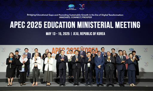 APEC 교육장관회의 개회식 입력 : 2025-05-14 18:29:33 수정 : 2025-05-14 18:29:32 대통령실사진기자단 구글 네이버 유튜브 대통령 권한대행 이주호 사회부총리(앞줄 가운데)가 14일 제주 서귀포시 제주국제컨벤션센터에서 열린 아시아태평양경제협력체(APEC·에이펙) 교육장관회의 개회식에서 각국 대표들과 기념촬영을 하고 있다. 기자 Copyright ⓒ 세계일보. 무단 전재 및 재배포 금지 세계일보