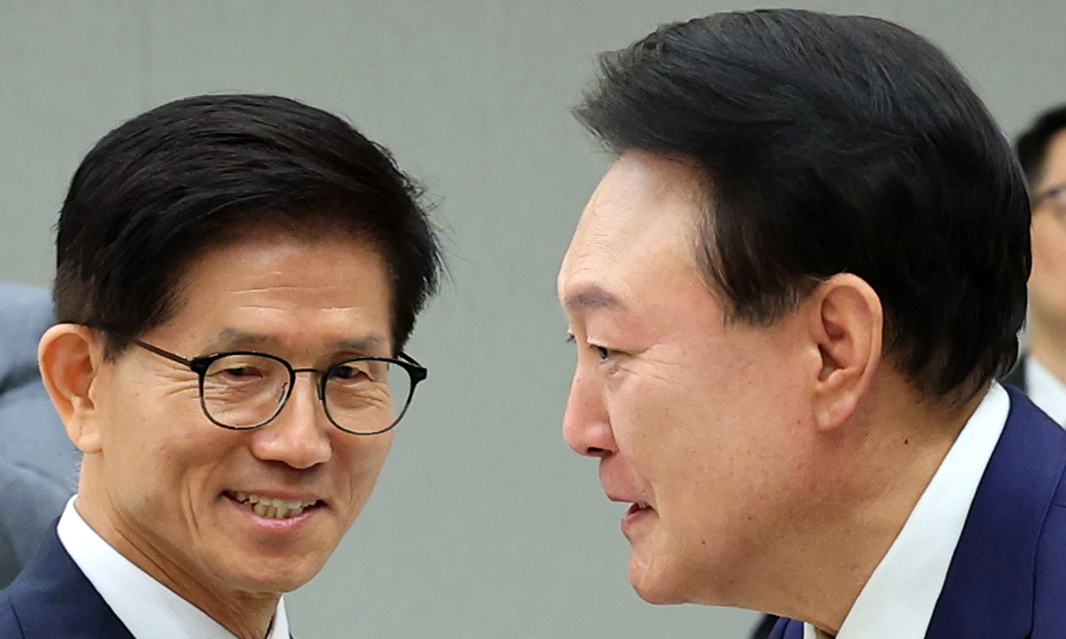 윤석열 대통령, 고용노동부 장관 임명장 수여식 참석 (서울=연합뉴스) 홍해인 기자 = 윤석열 대통령이 30일 서울 용산 대통령실 청사에서 열린 고용노동부 장관 임명장 수여식에 참석해 김문수 고용노동부 장관 부부와 인사하고 있다. 2024.8.30 [대통령실통신사진기자단] hihong@yna.co.kr/2024-08-30 11:36:59/ <저작권자 ⓒ 1980-2024 ㈜연합뉴스. 무단 전재 재배포 금지, AI 학습 및 활용 금지>